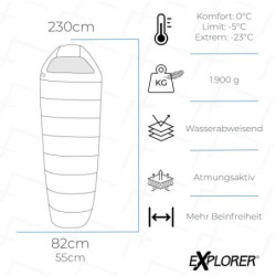 🌿 𝗞𝗢𝗠𝗣𝗔𝗞𝗧 - Der Mumienschlafsack lässt sich trotz der großen Liegefläche von 230 x 82 x 55 cm auf geringe 24 x 30 cm im Kompressions-Packsack verstauen, bei einem Gewicht von 1900 Gramm
