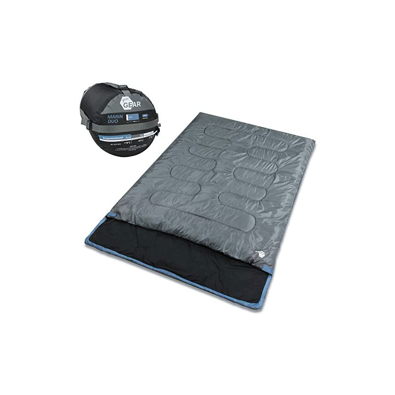 your GEAR Campingschlafsack Marin. Hochwertiger Doppelschlafsack für 2 Personen mit Kopfteil. Getesteter Temperaturbereich von +10°C bis -7 °C, verpackt in einem Kompressionspacksack