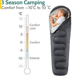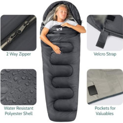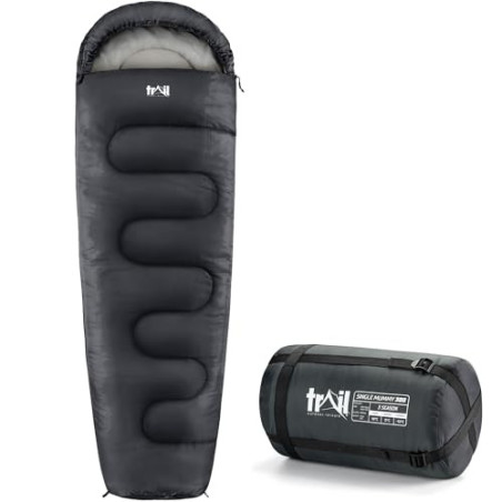 BIETET ULTIMATIVE WÄRME & KOMFORT: Erfreuen Sie sich während Ihres Campingausflugs an einem tiefen, erholsamen Schlaf in diesem 3-Jahreszeiten Mumien Camping Schlafsack von Trail Outdoor Leisure. Er verfügt über eine Hohlfaserfüllung mit 300 gsm, hat eine wasserresistente 190 T Polyester-Außenseite und ein atmungsaktives Futter aus Poly-Baumwolle, das sich sanft und anschmiegsam auf der Haut anfühlt – für höchsten Komfort während Ihres Schlafs.