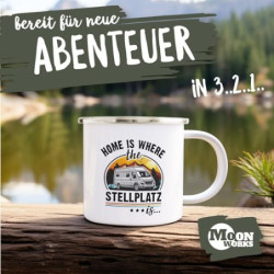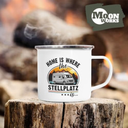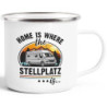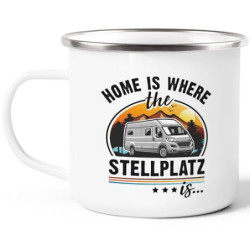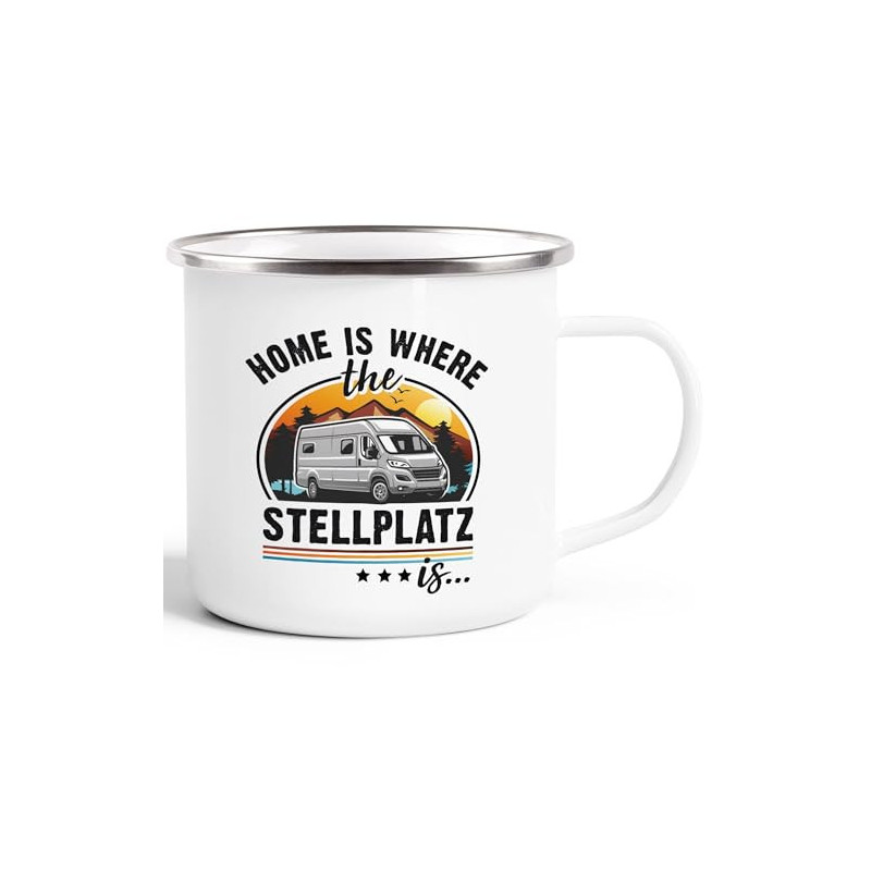 Ein Must-Have für leidenschaftliche Camping-Fans und Wohnmobilbesitzer. Mit witzigem Spruch in astreinem "Denglisch" "Home is where the Stellplatz is" und cooler Camping-Grafik im Retro-Stil ist dieser Emaillebecher das perfekte Zubehör für jedes Wohnmobil
