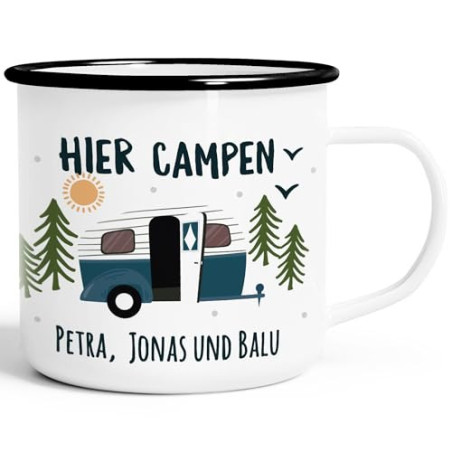 Cooles Geschenk für Campingbegeisterte und Wohnwagenfans. Die anpassbare Emailletasse mit Aufschrift "Hier Campen...+ Wunschnamen" ist das perfekte Accessoires für den nächsten Camping- Urlaub.
