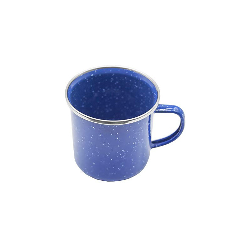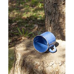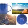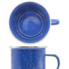 Klassisches Design: Stilvolle Emaille-Tasse in blau mit weißen Punkten, perfekt für Zuhause und unterwegs.