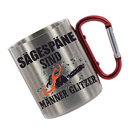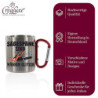 EDELSTAHL TASSE mit rotem Karabinerhaken. Perfektes Geschenk für Camper, Angler, Wanderer & Outdoorliebhaber – Fassungsvermögen: 330 ml – Höhe 90 mm – Gewicht 145 g