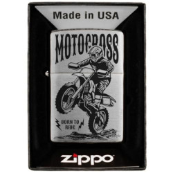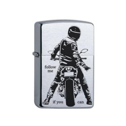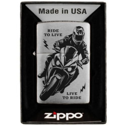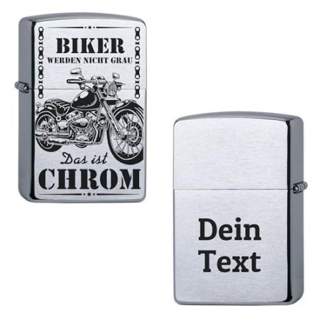 🏍️ Original Zippo Chrome Brushed Feuerzeug in Zippobox mit Gravur eines Motorrad Motives auf der Vorderseite und zusätzlich einem persönlichen Text auf der Rückseite.