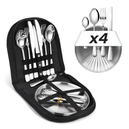 ✅ INHALT ❱ 4 Gabeln, 4 Messer, 4 Löffel, 4 Teller, 4 Teelöffel, 2 Grillzangen und 1 Steakmesser. Insgesamt 23 Stück. [Spülmaschinenfest].