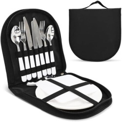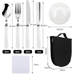 🔥Hochwertiges Campingbesteck Set: Enthält 2 Gabeln, 2 Löffel, 2 Messer, 2 Teller, 1 Flaschenöffner, 1 Steakmesser, 1 Schneidebrett und 1 Tragetasche. Ideal für Camping, Picknick, Wanderungen und andere Outdoor-Aktivitäten.