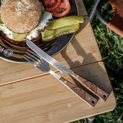 Leicht zu reinigen: Die Teile des rustikalen Camping-Bestecksets nach der Verwendung mit Wasser per Hand säubern und abtrocknen - gegebenenfalls Spülmittel verwenden