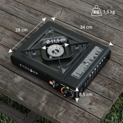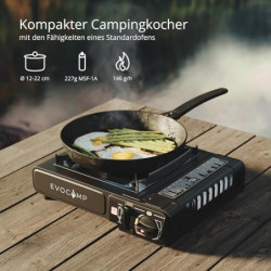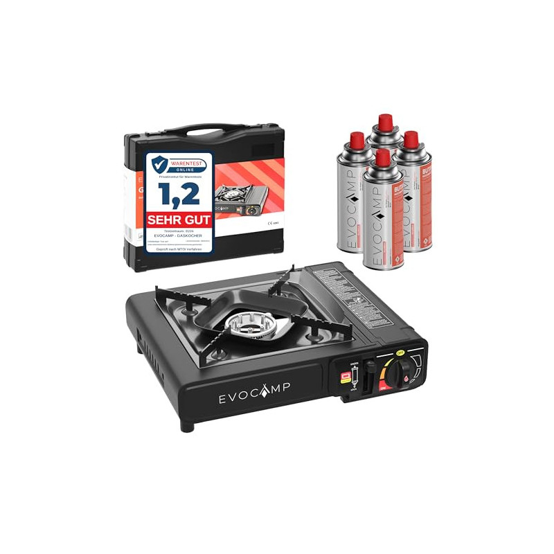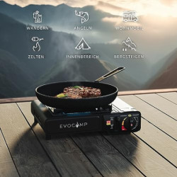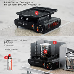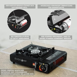 SICHERHEIT: Der EVOCAMP Camping Gaskocher ist aus hochwertigen Materialien hergestellt und nach den neuesten Sicherheitsstandards (2023) mit einem Hitzeschutz ausgestattet und geprüft. Das obere Element des Camping Gaskochers (Topfstellfläche) kann nicht abgenommen werden, was die Verwendung des Geräts noch sicherer macht. Außerdem ist der Kocher mit einem Stopper für zu große Töpfe ausgestattet, um die Brandgefahr zu minimieren.