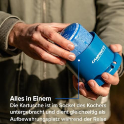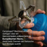 Einfache Handhabung: Die Stechgaskartusche lässt sich mühelos in den Kocher stecken, anschließend wird das Gehäuse zugeschraubt, die Kunststoffglocke sorgt für Stabilität und schützt die Kartusche