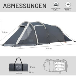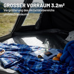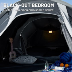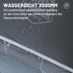 BLACKOUT: Dieses 2-3-Personen-Tunnelzelt besteht aus 190T-Polyestergewebe mit PU-Beschichtung und mit einer Wassersäule von 3.000 mm. Es ist mit Glasfaserstangen mit einem Durchmesser von 9,5 mm ausgestattet, stabil und langlebig, um Ihnen ein angenehmes Camping-Erlebnis zu ermöglichen.