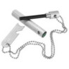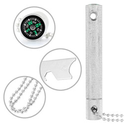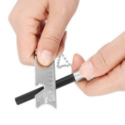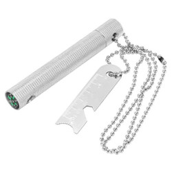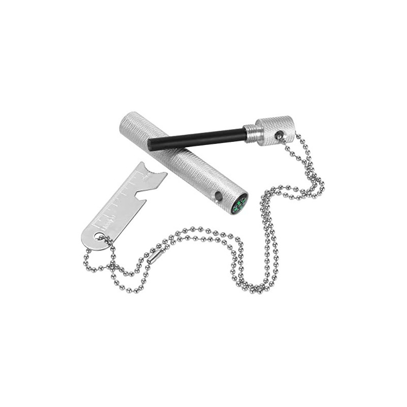 Der Feuerstein ist in einem robusten Alugehäuse mit einer Riffelung. Inklusive einer 70 cm Kette Nutzlänge ist 35 cm. Der Feuerstarter ist mit einem Kompass, Lineal, Messstab, Flaschenöffner, Sechskantschlüssel ausgestattet.