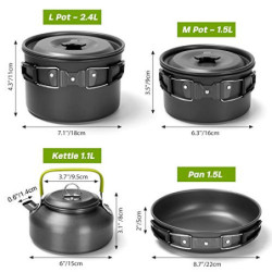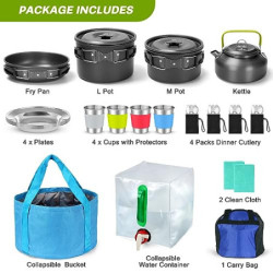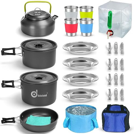 【Perfektes Camping-Topfset】 - 29-teiliges Camping-Kochgeschirr-Set】Kommt mit 1 L Topf, 1 M Topf, 1 Bratpfanne, 1 1,2 Liter Wasserkocher, 1 2,6 Gallone/10L zusammenklappbarer Behälter, 1 12 Liter zusammenklappbarer Eimer, 4 x 230ml Edelstahlgläser mit Silikonschutz, 4 x 18cm Edelstahlteller, 4 x Bestecksets (4 Gabeln, 4 Messer, 4 Löffel mit 4 Taschen), 2 x Reinigungstuch und 1 x Tragetasch