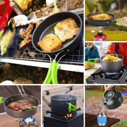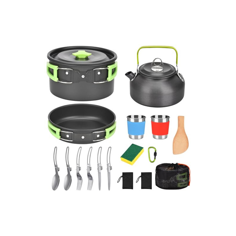 【Package Include】17 PCS Camping-Kochgeschirr-Set mit 1 Topf, 1 Pfanne, 1 Wasserkocher, 2 Tassen, 2 Löffeln, 2 Gabeln, 2 Messern, 2 Bestecktaschen, 1 Holzspatel, 1 Schwamm, 1 Karabiner und 1 Netzbeutel. Erfüllen Sie die Kochbedürfnisse von 2-3 Personen und genießen Sie das Kochen, wo immer Sie sind.