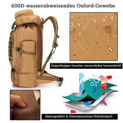 【Groß Trekkingrucksack 80 liter】Der 80L Campingrucksack mit großer Kapazität, fassen alle Ihre täglichen Notwendigkeiten wie Zelte, feuchtigkeitsbeständige Polster und Schlafsäcke , Alpenstöcke, Kleidung und Mini-Herd.In den Fächern oben, unten und an den Seiten kann gut kleinere Sachen verstauen, wie Regenschirme, Tassen, Seile, Lebensmittel usw. Sehr gut geeignet für Outdoor-Sportarten.