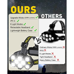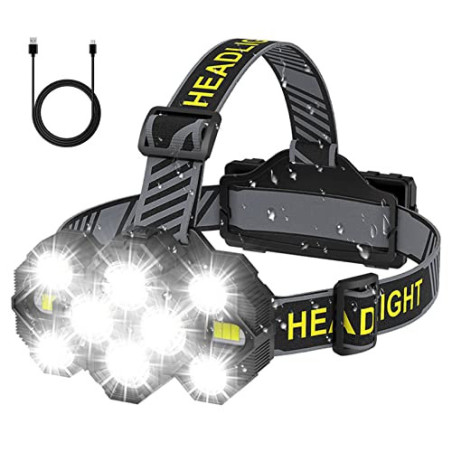 SUPERHELLE 10 LED KOPFLAMPE: Die 2024 Upgrade LED Stirnlampe der Hochwertige Batterie unterstützt schnelles Aufladen, eingebaute wiederaufladbare Batterie und kommt mit einem Typ-C USB-Ladekabel für 7-8 Stunden Gebrauch. Der Scheinwerfer profitiert vom fortschrittlichen T6*4+XPE*4+SMD*8 LED-Lichtdesign. Die Batterielebensdauer des wiederaufladbaren Scheinwerfers ist dreimal länger als der herkömmliche Scheinwerfer auf dem Markt.