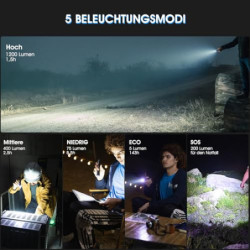 AUFLADBAR TAKTISCHE TASCHENLAMPE: Die wiederaufladbare Taschenlampe WUBEN L50 verfügt über einen P9-LED-ausgewählten glatten, aluminiumbeschichteten Reflektor und eine doppelseitige, ultraklare Beschichtungslinse. Die hohe Qualität des Materials verbessert die Lichtdurchlässigkeit der WUBEN L50 erheblich und sorgt dafür, dass diese Taschenlampe mit hoher Lumenzahl 1200 Lumen starkes Licht abgibt. Laufzeit bis zu 143 Stunden (ECO).