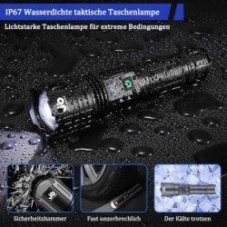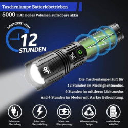 LED TASCHENLAMPE USB AUFLADBAR: Die wiederaufladbare LED-Taschenlampe ist mit einem 5000-mAh-Akku mit hoher Kapazität ausgestattet, der bis zu 4 Stunden im hellen Lichtmodus und beeindruckende 12 Stunden im schwachen Lichtmodus durchhält. Sie wird direkt über den eingebauten USB-Anschluss aufgeladen, was die Benutzung erleichtert