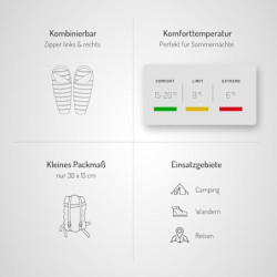 SCHLAFSACK ZUM VERBINDEN FÜR ZWEI PERSONEN: zwei Schlafsäcke können miteinander zu einem Doppel-Schlafsack verbunden werden (Reißverschluss links und rechts).