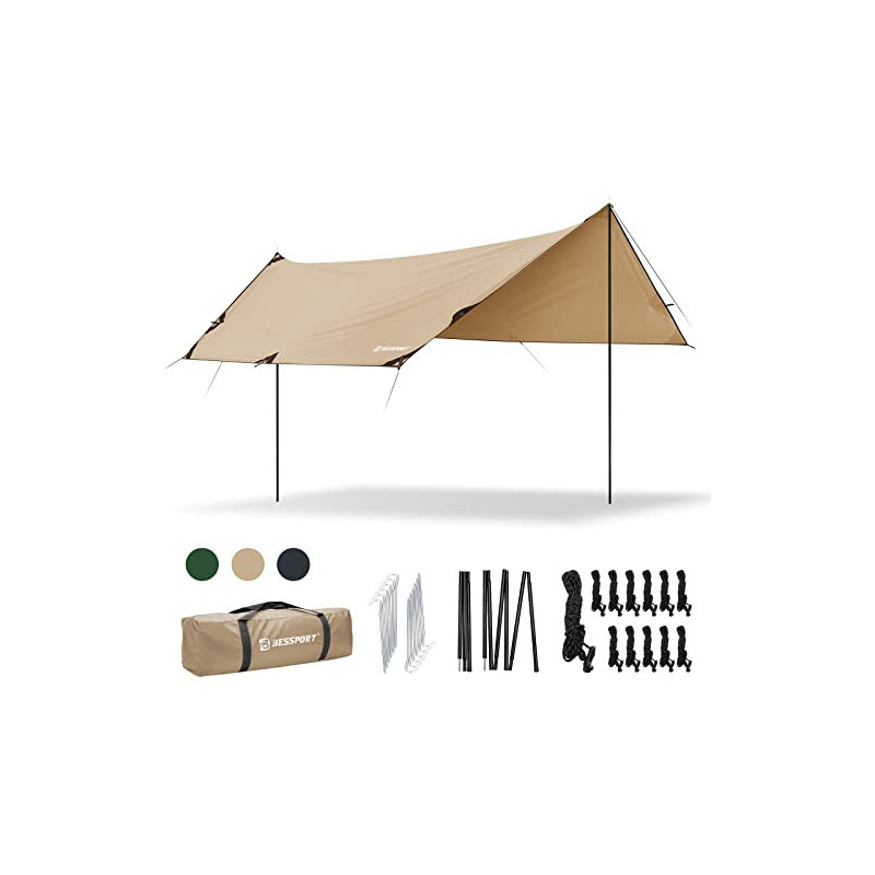 Wasserdicht und UV-beständig: Die wasserdichte tarp besteht aus 210T Ripstop-Polyestergewebe, das wind- und reißfest ist, und hat eine PU-3000 mm Wasserbeständigkeit. Camping tarp sind außerdem UV-beständig, um Sie beim Einsatz im Freien vor der Sonne zu schützen.