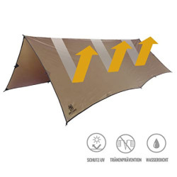 Das Segel ist überall schnell und einfach montiert, praktisch um Personen, Gepäck und Ausrüstung vor Regen, Schnee, Wind oder Sonne zu schützen.