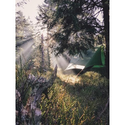 LEICHTE HANDHABUNG – Mit dem Verstellkarabiner und Y-Heringen lässt sich das Tarp schnell und einfach aufhängen. Kleine Taschen zum Verstauen der Seile sorgen für zusätzlichen Komfort.