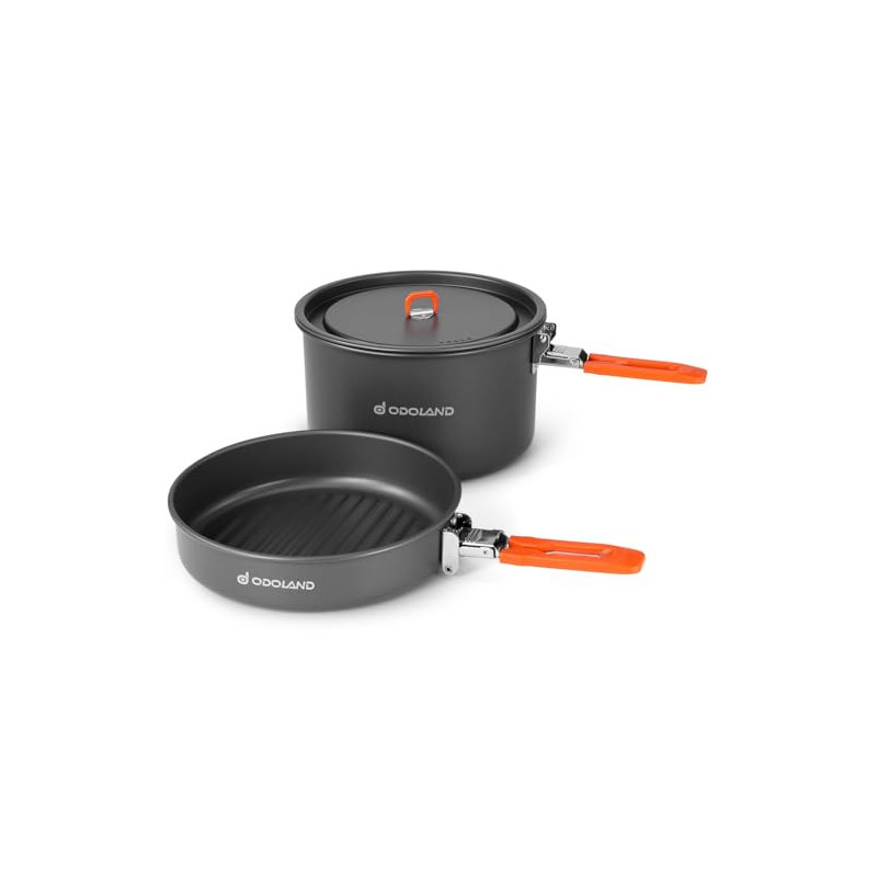 Odoland Camping Kochgeschirr Set - Perfekt für das Kochen im Freien. Unser Camping Kochgeschirr-Set besteht aus einem 4L Topf mit Deckel und einer 1,5L Bratpfanne. Alle Teile können in einer Netztasche aufbewahrt und leicht transportiert werden.