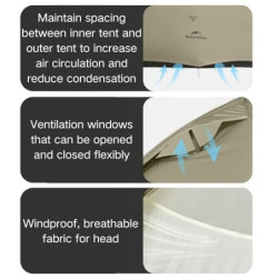 【Luftstrom im Zelt】Halten Sie den Abstand zwischen Innenzelt und Außenzelt ein, um die Luftzirkulation zu erhöhen und Kondensation zu reduzieren. Lüftungsfenster, die sich flexibel öffnen und schließen lassen