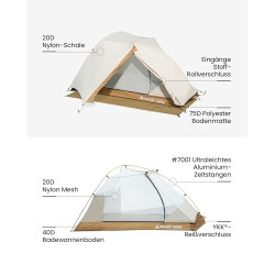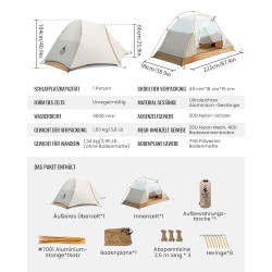 【Zelt Konzipiert für 1 Person】Mit den Maßen 220 cm * 98 cm bietet es einer Person bequemen Schlafplatz und Platz zum Organisieren der Ausrüstung. Die Decke des Mini Zelt ist mit einem Querbalken versehen, um den oberen Raum zu vergrößern, und die maximale Deckenhöhe beträgt 105 cm, sodass es für einen einzelnen Camper bequem ist. Es gibt einen Vorraum, in dem Schuhe und Gepäck untergebracht werden können.