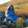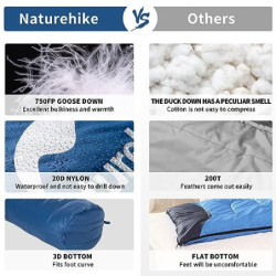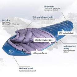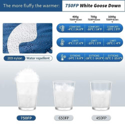 【Weiße Gänsedaunen】Der Daunenschlafsack ist mit 90 % hochwertiger weißer Gänsedaune (1000 g/750 FP) gefüllt, die Sie bei -15 °C warm hält. Die streifenförmigen Windschutzstreifen isolieren effektiv die Kälte und verhindern Wärmeverlust.