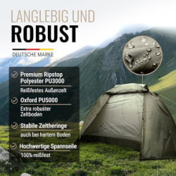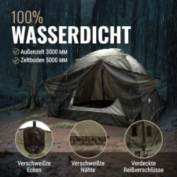 100% WETTERFEST - ausgelegt für jedes Wetter! Wasserdichtes Außenzelt (210T Polyester Ripstop - Wassersäule 3.000mm), Zeltboden (Oxford - Wassersäule 5.000mm), verdeckte Reißverschlüsse sowie von Innen verschweißte Nähte halten jedem Wetter stand!